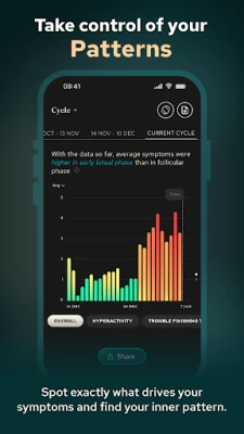 Få uovertruffen klarhed ved at overvåge og analysere dine symptomers sværhedsgrad gennem hele din cyklus. Belles visualiseringer afslører de hormonelle skift og forklarer deres potentielle virkninger, suppleret med anbefalinger til aktiviteter, der kan optimere dit velbefindende. Vores tilpassede PMDD-tracker er designet efter DRSP-standarder og giver dig mulighed for at registrere et bredt spektrum af symptomer – fra humørsvingninger og angst til hjernetåge og søvnforstyrrelser. Uanset om det er følelsesmæssige, mentale, adfærdsmæssige eller fysiske manifestationer, kan du tilpasse kategorier og tilføje personlige observationer. Brug den dybdegående dataside til at afdække mønstre og træffe informerede beslutninger, og styrk din dialog med læger med en medicinsk godkendt PMDD-rapport, tilgængelig i flere formater for nem deling.