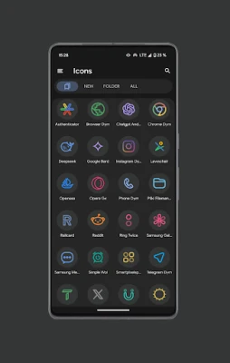 Træd ind i en verden af raffineret skærmæstetik med en ikonpakke designet til at forvandle din enhed. Oplev en dybdegående visuel forvandling, hvor hver detalje er skabt med omhu. Denne unikke samling omfavner et sofistikeret designsprog, der forener skarpe, lineære ikoner med en palet af dybe, mørke farver. Lad din startskærm afspejle elegance med et strømlinet udtryk, der skiller sig ud fra mængden.