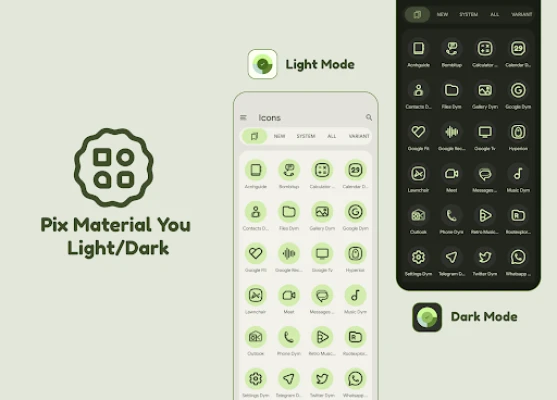 Pix Material You Light/Dark Themed Icons leverer dynamiske ikoner, der automatisk tilpasser farve efter dit tapet og systemets accentfarve. De skifter også problemfrit med din enheds mørk- eller lystilstand. Ideel til brugerdefinerede launchers, men kan også anvendes på standard launchers.